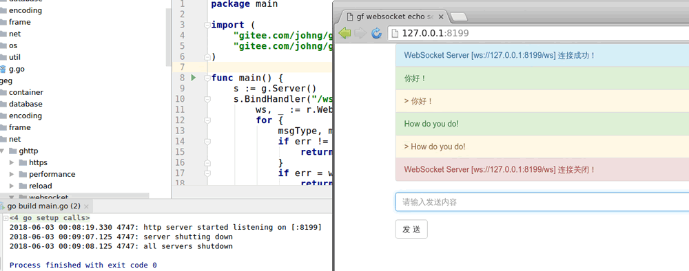 我们首先执行示例代码 main.go,随后访问页面 http://127.0.0.1:8199/,随意输入请求内容并提交,随后在服务端关闭程序。可以看到,页面会回显提交的内容信息,并且即时展示websocket的连接状态的改变,当服务端关闭时,客户端也会即时地打印出关闭信息。