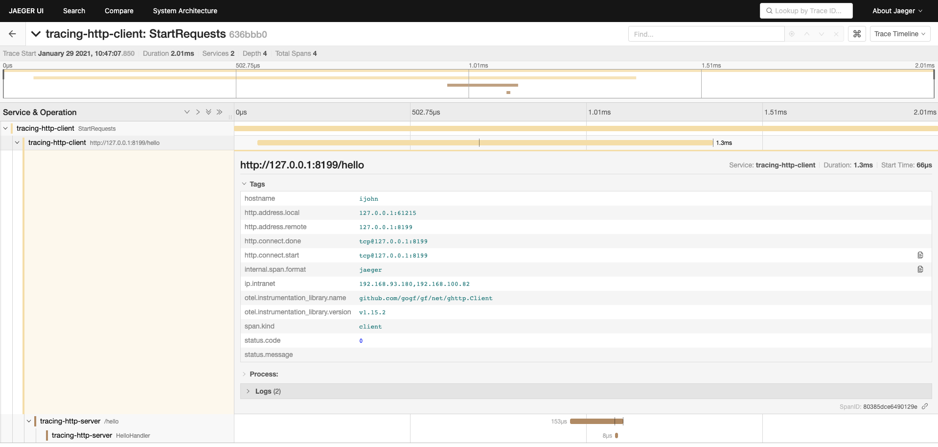 可以看到在这里出现了两个服务名称: tracing-http-clienttracing-http-server,表示我们这次请求涉及到两个服务,分别是HTTP请求的客户端和服务端,并且每个服务中分别涉及到 2span 链路节点。