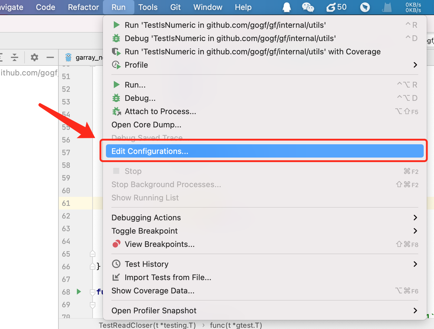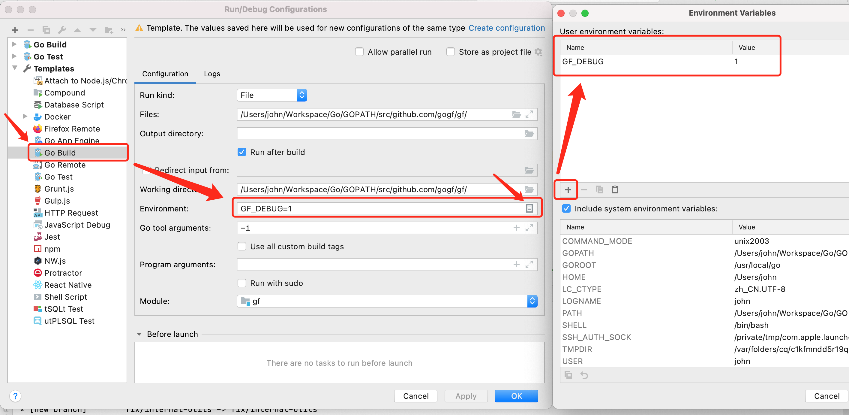 我们以 Goland IDE 为例,在运行模板中添加 GF_DEBUG 环境变量即可。