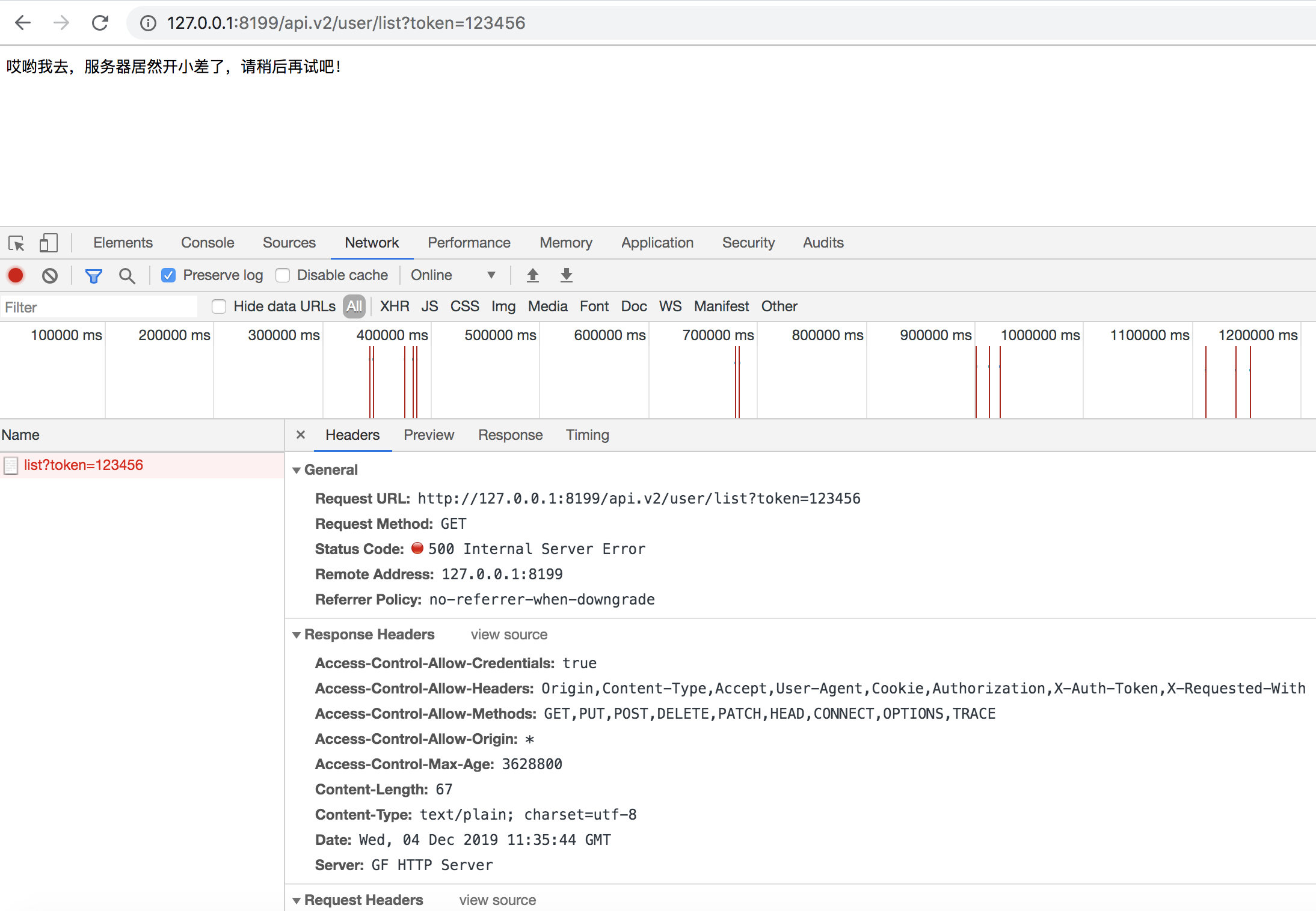 可以看到,我们的服务方法绑定了两个中间件,跨域中间件和而鉴权中间件。 请求时将会按照中间件注册的先后顺序,先执行 MiddlewareCORS 全局中间件,再执行 MiddlewareAuth 分组中间件。 随后我们可以通过请求 http://127.0.0.1:8199/api.v2/user/listhttp://127.0.0.1:8199/api.v2/user/list?token=123456 对比来查看效果。