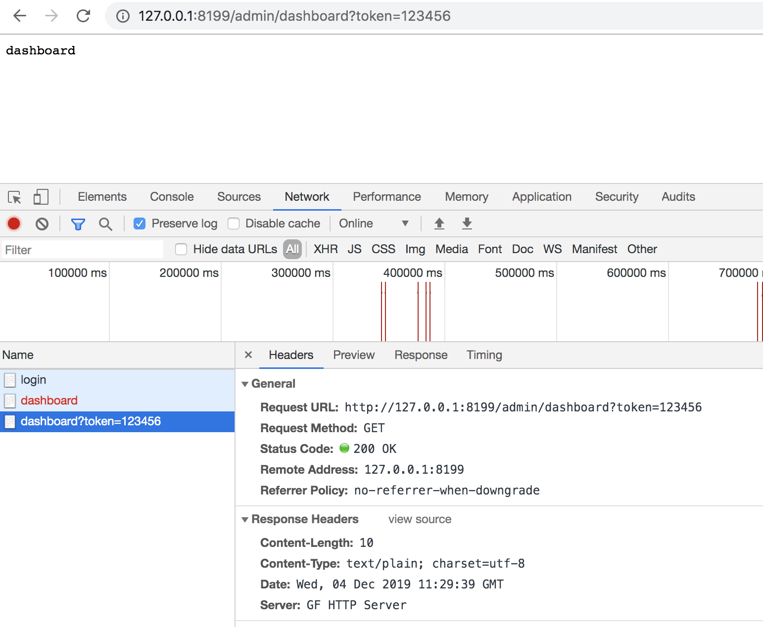 可以看到,只有 /admin/dashboard 路由的服务方法绑定了鉴权中间件 main.MiddlewareAuth,而 /admin/login 路由的服务方法并没有添加鉴权处理。 随后我们访问以下URL查看效果: