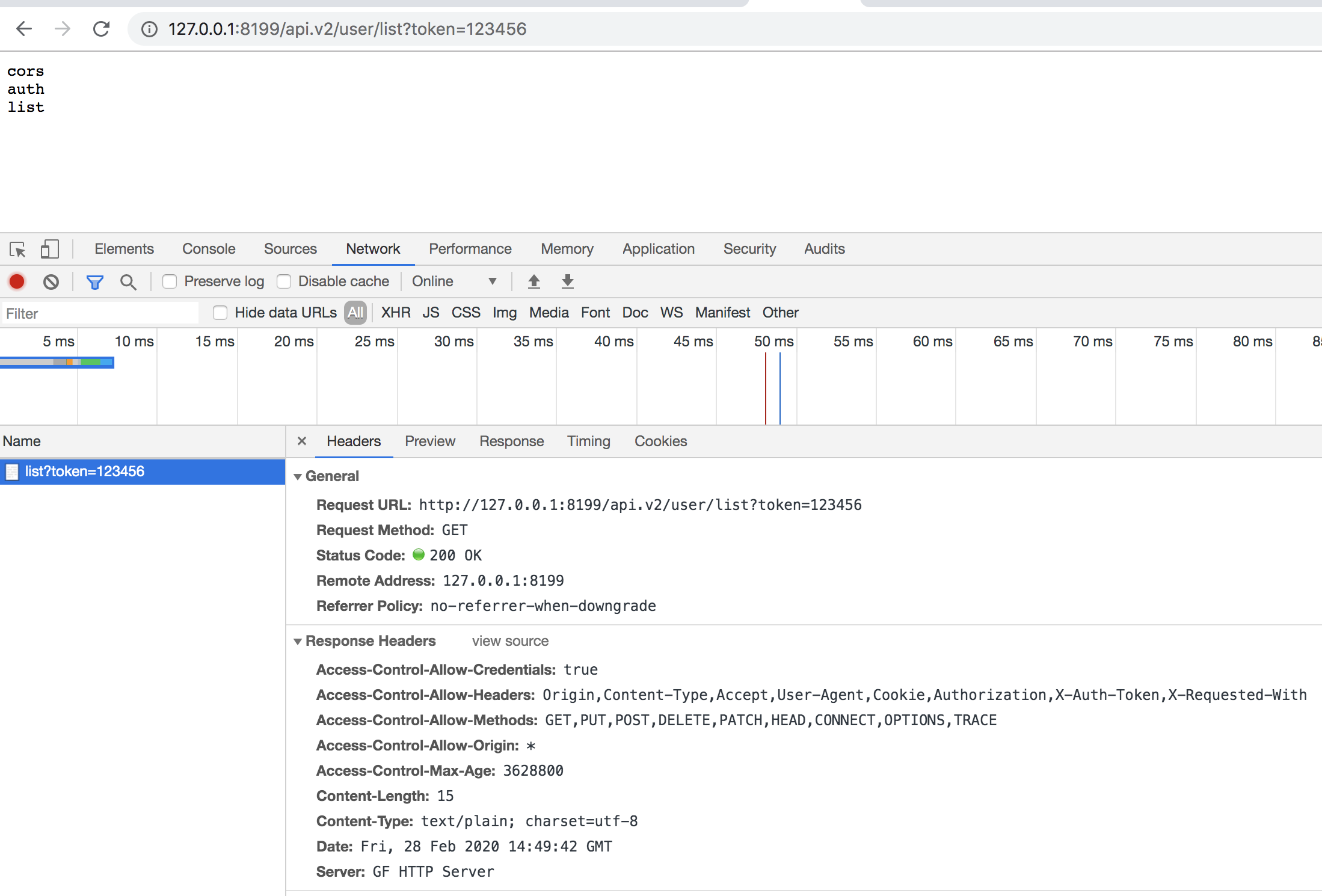 这里我们使用 group.Middleware(MiddlewareCORS) 将跨域中间件通过分组路由的形式注册绑定到了 /api.v2 路由下所有的服务函数中。随后我们可以通过请求 http://127.0.0.1:8199/api.v2/user/list 来查看允许跨域请求的 Header 信息是否有返回。