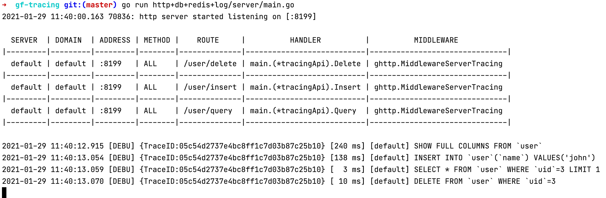 我们再来看一个相对完整一点的例子,包含几个常用核心组件的链路跟踪示例,示例代码地址: https://github.com/gogf/gf/tree/master/example/trace/http_with_db