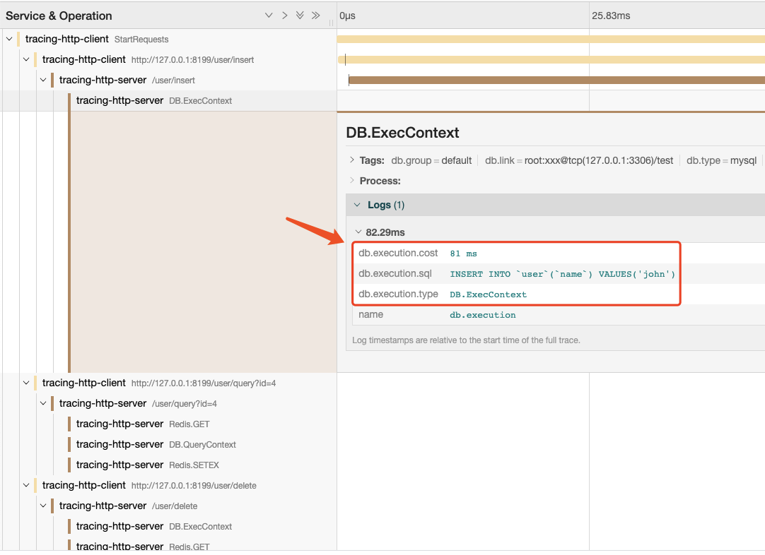 HTTP Client&ServerLogging 组件在之前已经介绍过,因此这里我们主要关注 ormredis 组件的链路跟踪信息。