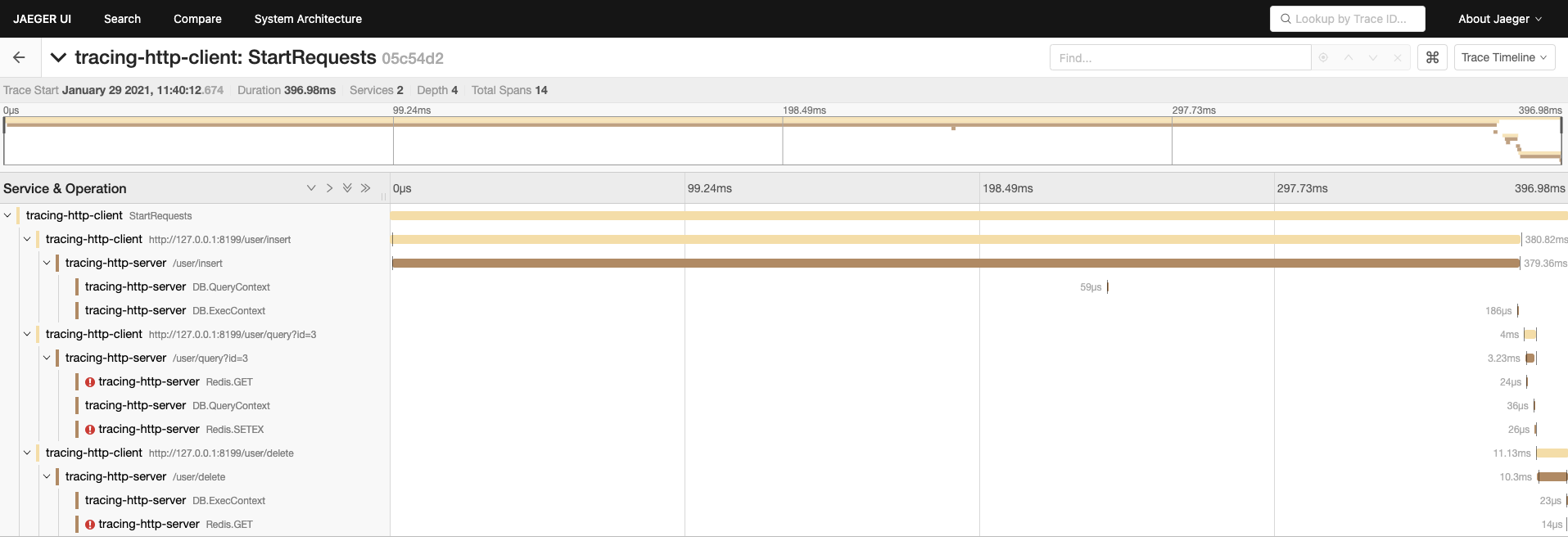 再把上面的客户端运行一下,查看 jaeger