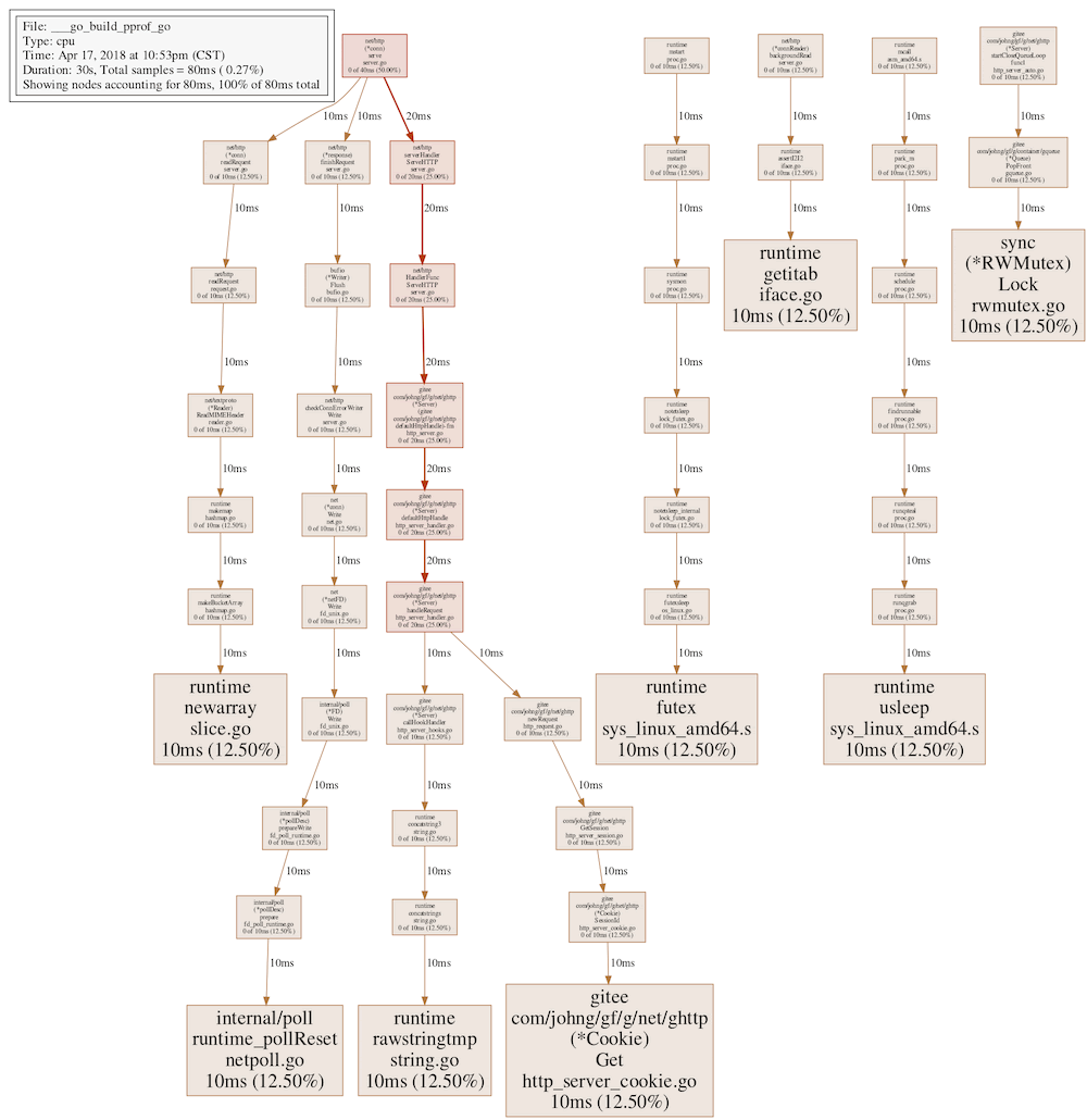 其中 web 命令用以图形展示接口之间的调用关系以及性能情况,但是需要安装 Graphviz 图形化工具,以我目前的系统为 Ubuntu 为例,直接执行 sudo apt-get install graphviz 命令即可安装完成图形化工具(如果是 MacOS,使用 brew install Graphviz 安装),随后再次使用 web 命令,最终生成以下图表: