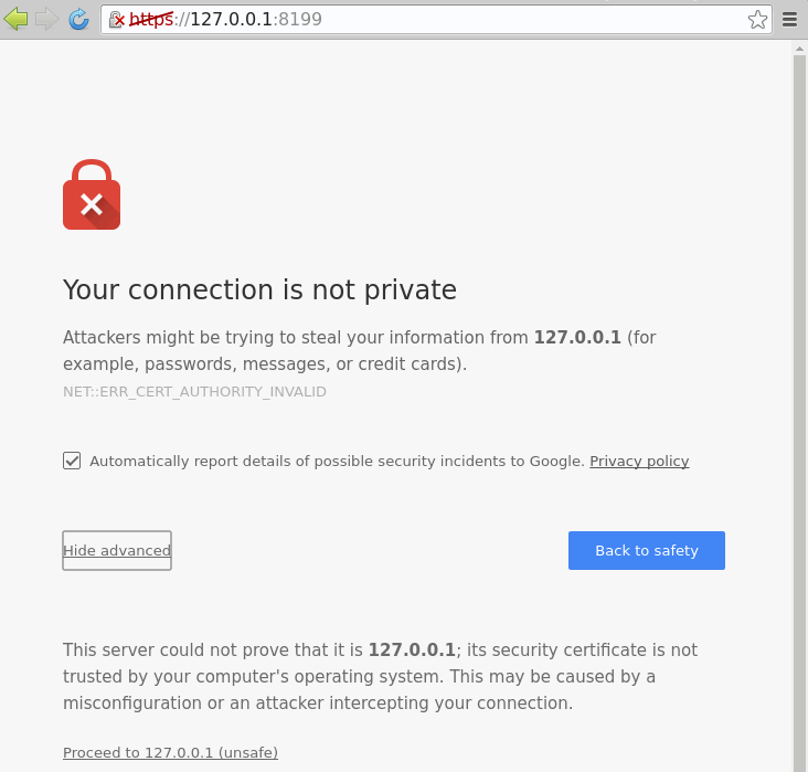 我们这里直接点击 Advanced,然后点击 Proceed to 127.0.0.1 (unsafe),最终可以看到页面输出预期的结果: