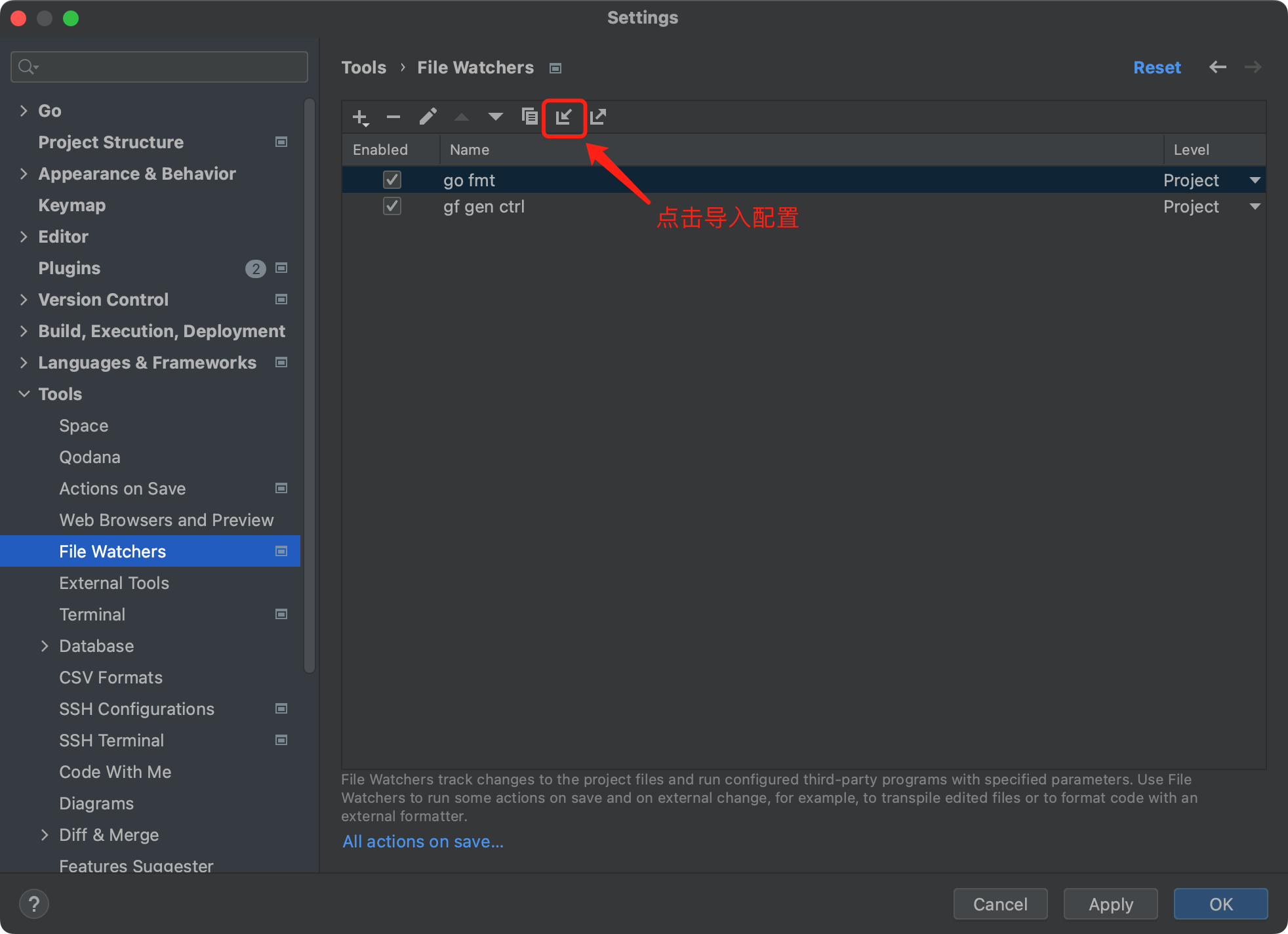 如果您是使用的 GolandIDE,那么可以使用我们提供的配置文件: watchers.xml  自动监听代码文件修改时自动生成接口文件。使用方式,如下图: