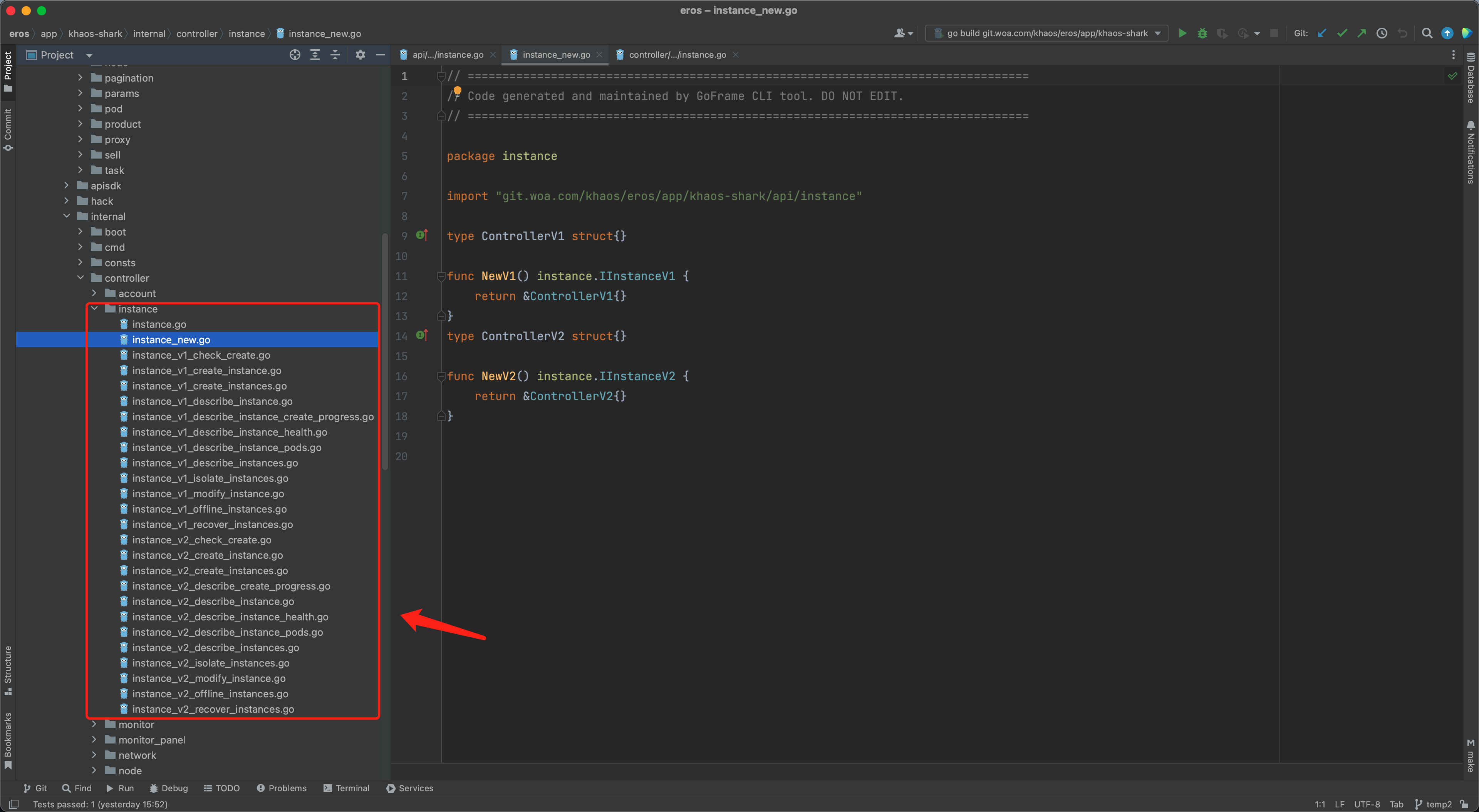 如果是手动执行命令行,直接在项目根目录下执行 gf gen ctrl 即可,她将完整扫描 api 接口定义目录,并生成对应代码。