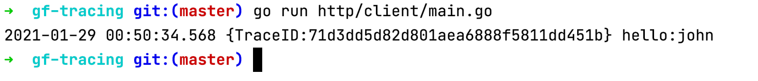 4. 最后,这里使用了 g.Log().Print(ctx, content) 方法打印服务端的返回内容,其中的 ctx 便是将链路信息传递给日志组件,如果 ctx 上下文对象中存在链路信息时,日志组件会同时自动将 TraceId 输出到日志内容中。