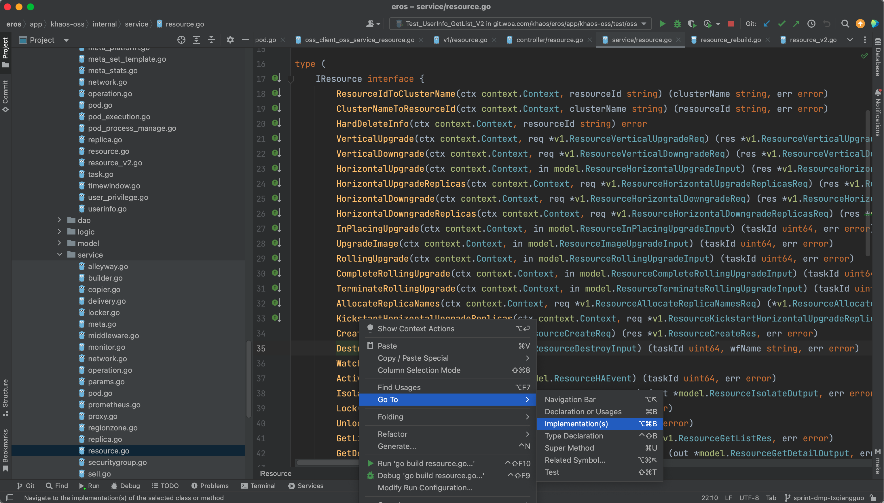> 这里我推荐使用 Goland IDE,有个很棒的接口实现定位功能,具体如图。找到接口定义后,点击左边的小图标可快速定位具体的实现。如果Goland不显示小图标,可以尝试升级使用最新版本的 Goland 哈。