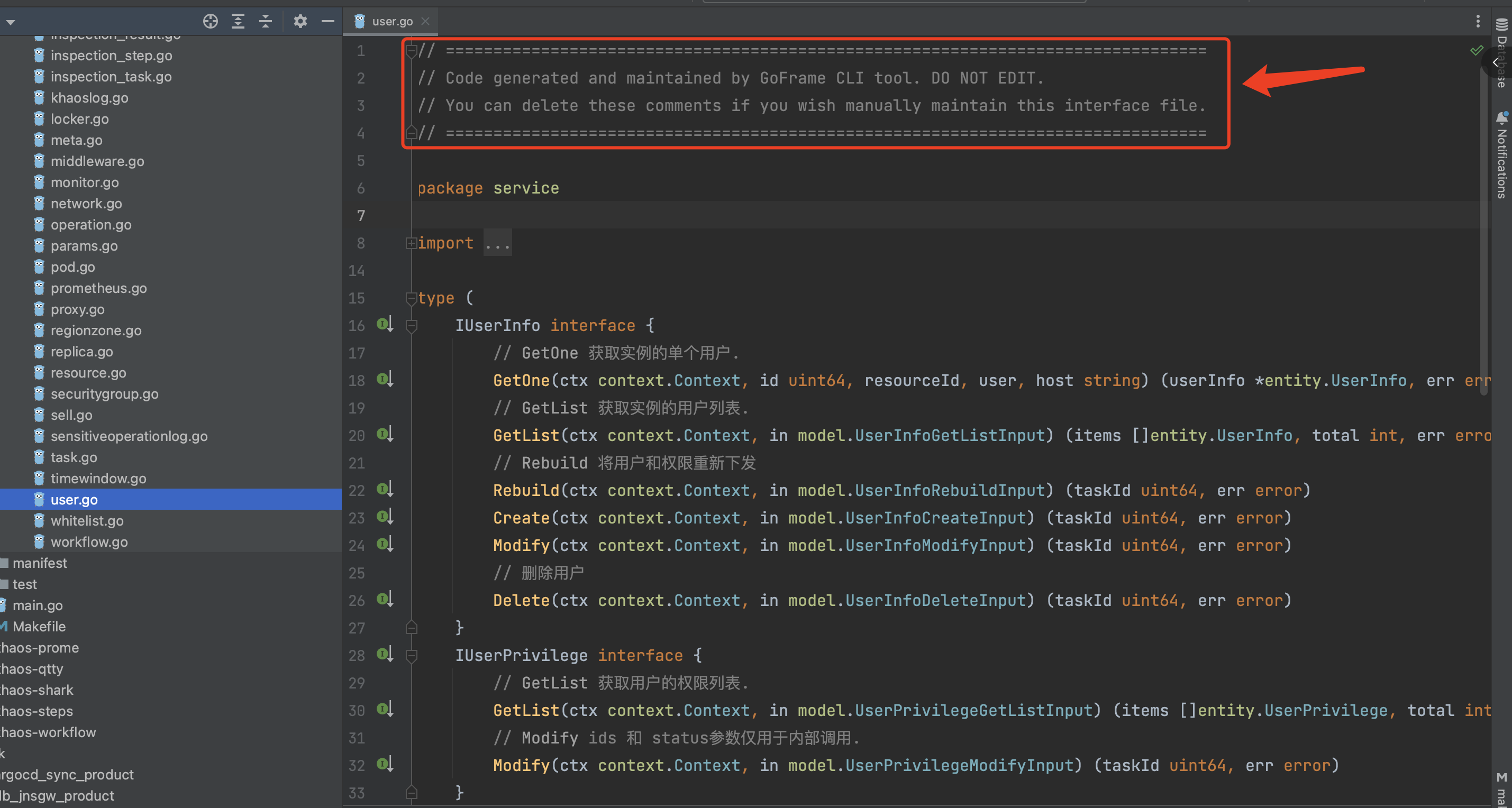 框架的工程管理当然也支持标准的接口代码管理方式,即支持先定义 service 接口,再编码 logic 具体实现。需要注意的是,这个 service 的源代码中不能出现顶部工具的注释信息(工具依靠这个注释来判断该文件是否可覆盖😈),很多同学复制粘贴的时候把文件顶部注释保留了,就会引起手动维护接口文件失效。具体见截图注释: