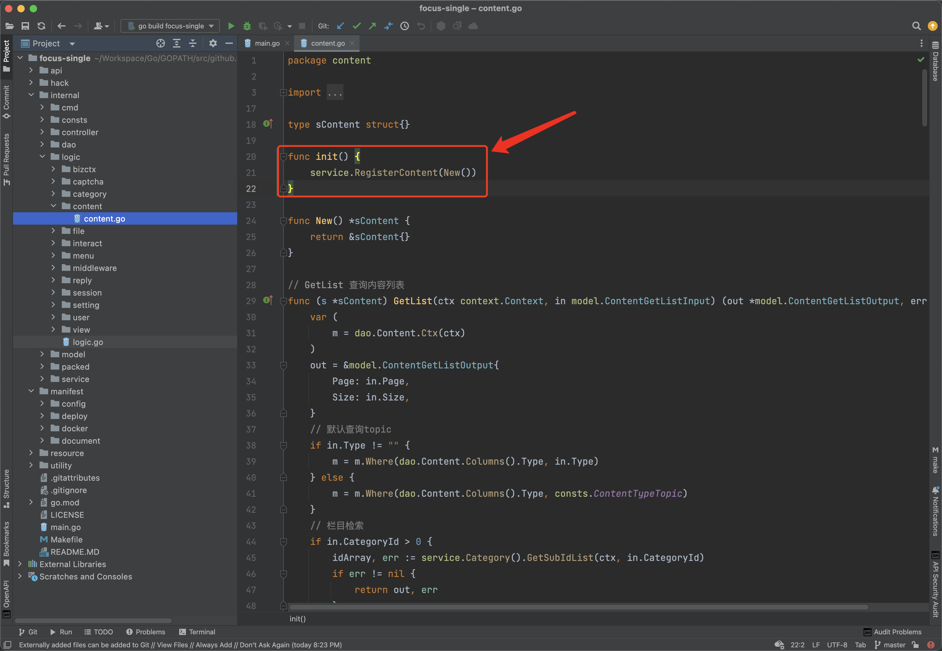 该文件的引入需要在 main 包的最顶部引入,需要注意 import 的顺序,放到最顶部,后面加一个空行。如果同时存在 packed 包的引入,那么放到 packed 包后面。像这样: