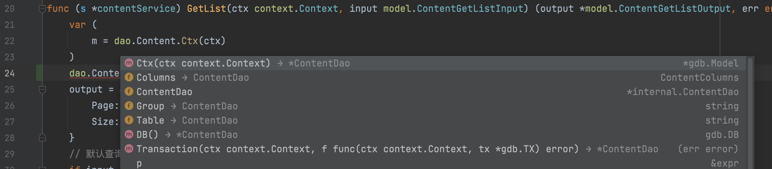 3、 dao 中的文件按照数据表名称进行命名,一个数据表一个文件及其一个对应的 DAO 对象。操作数据表即是通过 DAO 对象以及相关操作方法实现。 dao 操作采用规范化设计,必须传递 ctx 参数,并在生成的代码中必须通过 Ctx 或者 Transaction 方法创建对象来链式操作数据表。
