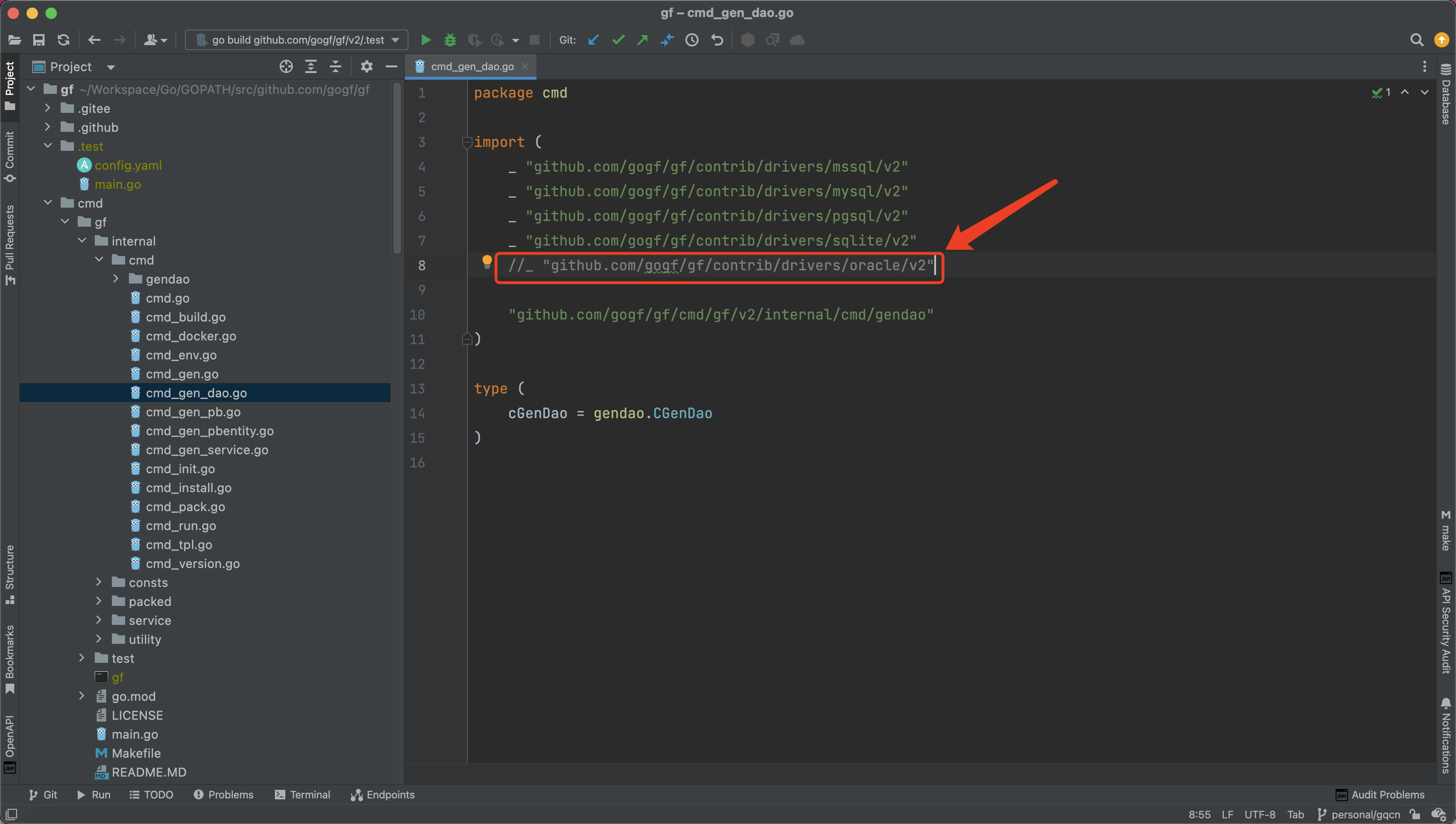 gen dao 命令涉及到数据访问相关代码生成时,默认支持常用的若干类型数据库。如果需要 Oracle 数据库类型支持,需要开发者自己修改源码文件后自行本地手动编译生成 CLI 工具随后安装,因为这两个数据库的驱动需要 CGO 支持,无法预编译生成给大家直接使用。