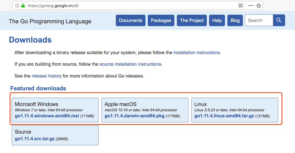 访问Go国内镜像站下载页面 https://golang.google.cn/dl/,并在页面最上方的版本中选择你当前的系统版本,会下载最新版本的Go开发包: