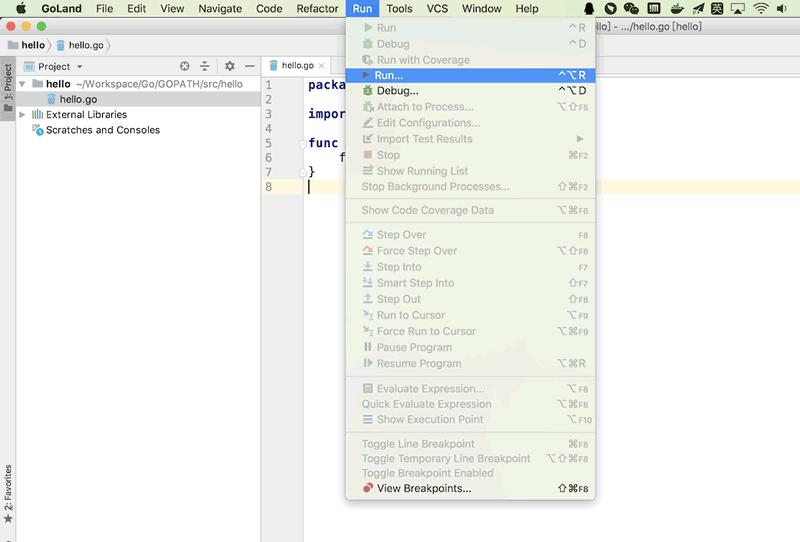 菜单栏 Run - Run - go build hello.go
