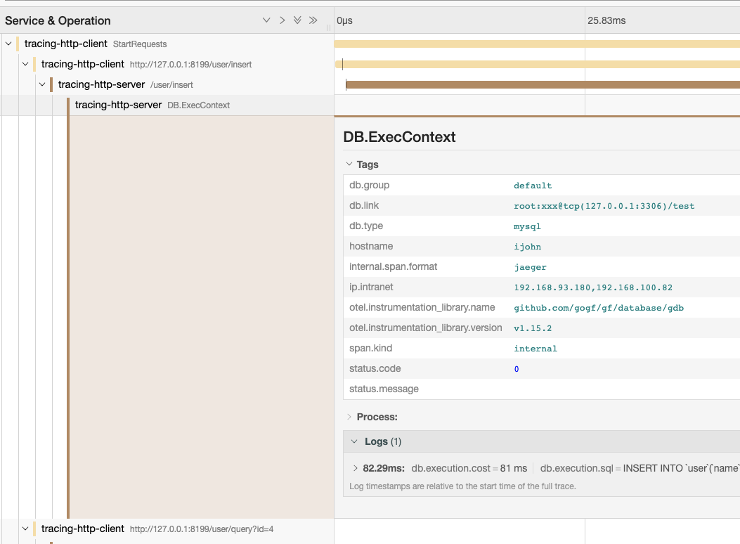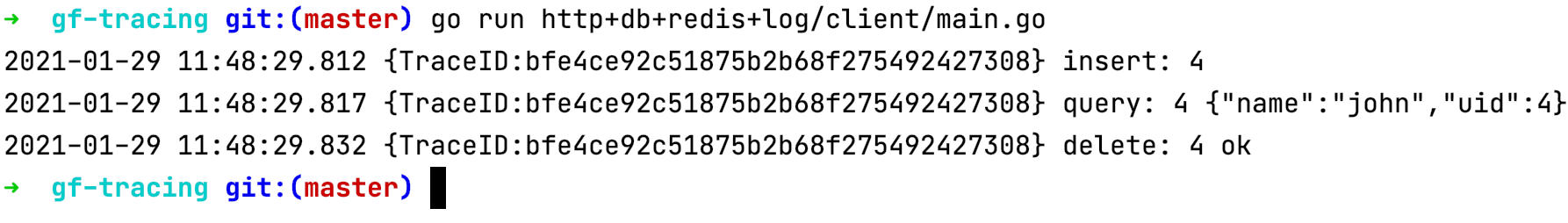 我们再来看一个相对完整一点的例子,包含几个常用核心组件的链路跟踪示例,示例代码地址: https://github.com/gogf/gf/tree/master/example/trace/http_with_db