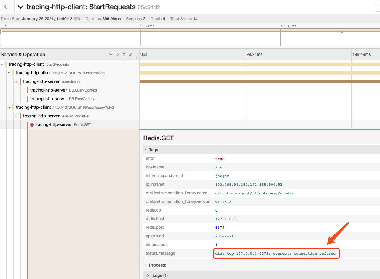我们看到好像所有的 redis 操作都报错了,随便点击一个 redis 的相关 span,查看一下详情呢: