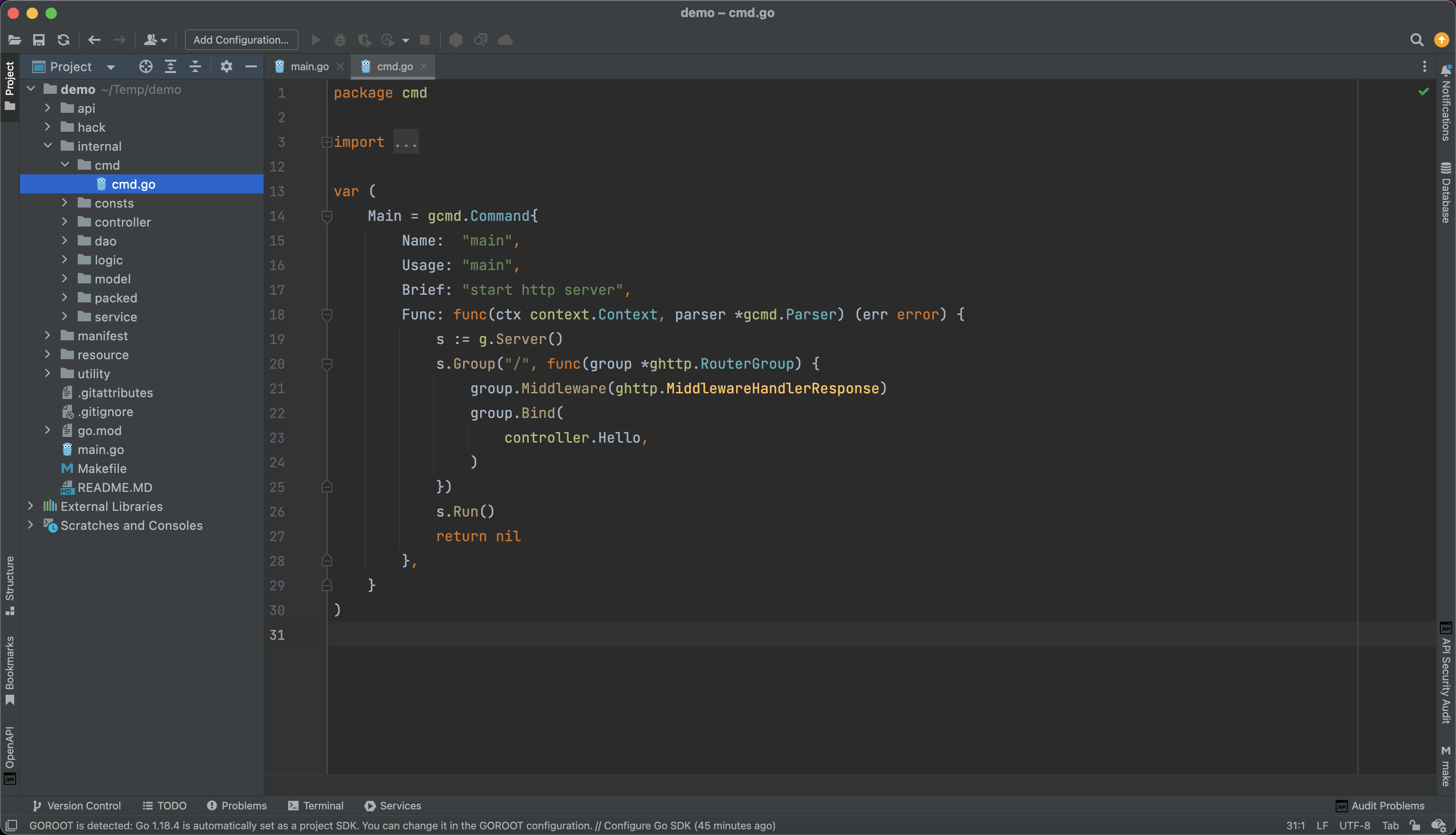 Main 对象的 Run 命令的主要作用是做引导启动,将一些动态初始化的逻辑放到 Main 的 Run 方法中。在项目模板中,默认创建一个 HTTP Server,然后通过分组路由的方式注册路由,并启动 HTTP Server。随后 HTTP Server 将会阻塞运行,它同时也会异步监听系统信号,直至收到退出信号后,它会优雅关闭连接随后退出进程。