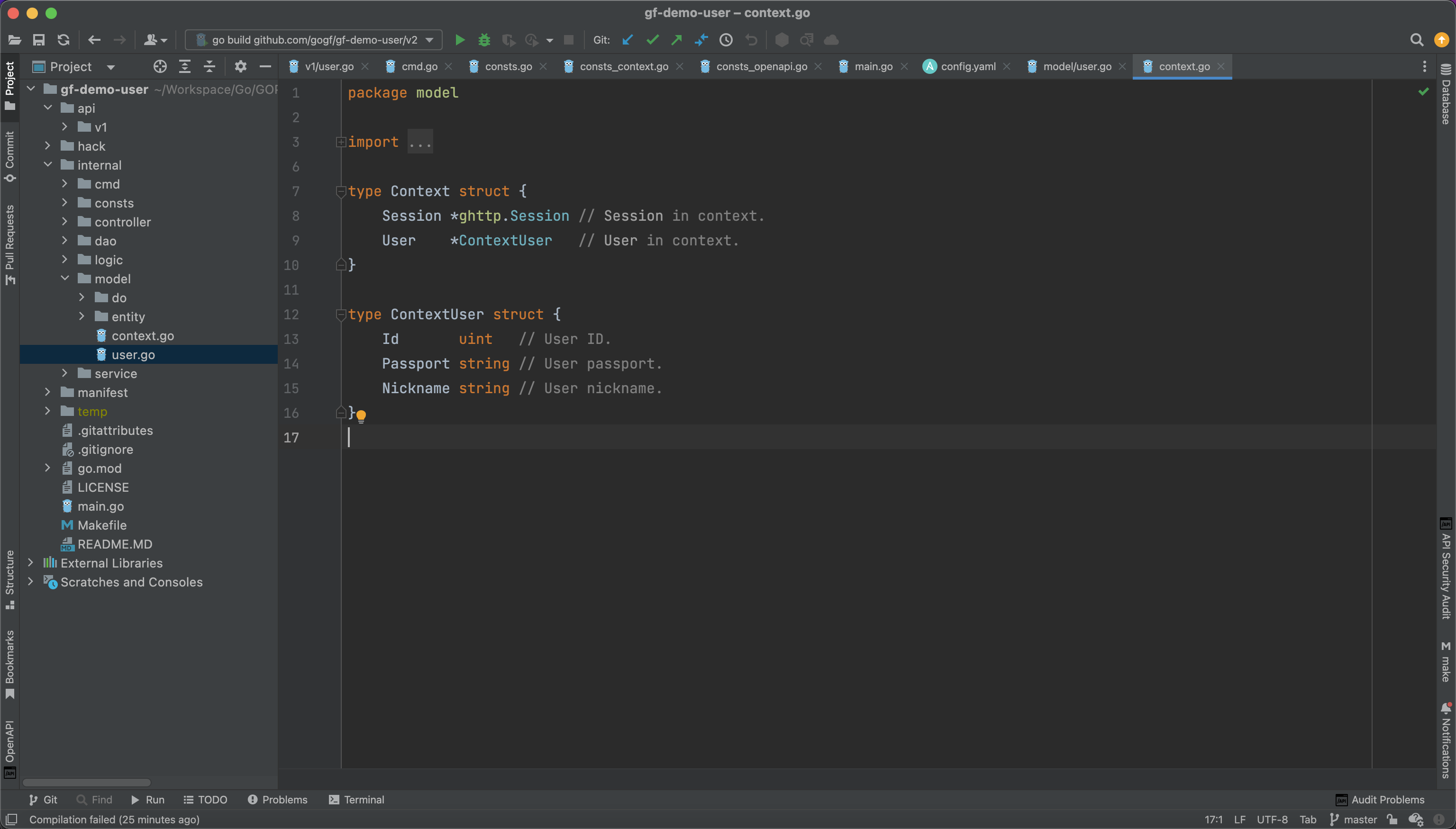 接口注册文件位于 api 目录下,由于该项目采用了规范路由注册方式,因此在API结构体的属性中包含一些标签。其中结构体属性的 v 标签表示校验规则,请求参数进入 HTTP Server 后将会被自动执行校验(框架有非常强大的数据校验组件,更详细的介绍请参考章节: 数据校验)