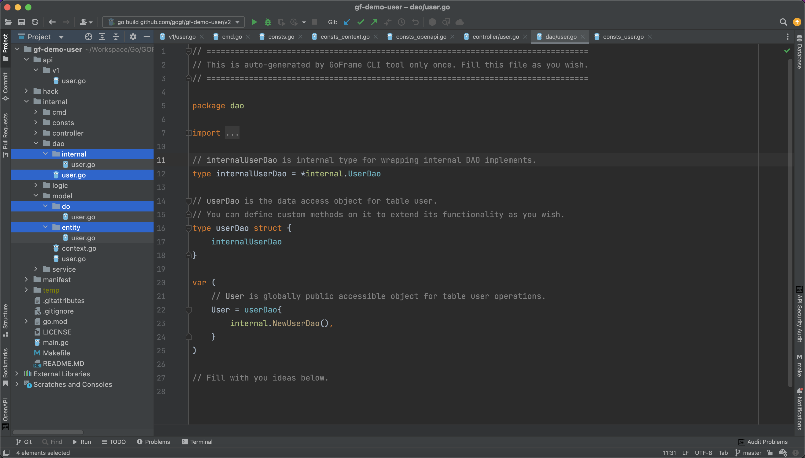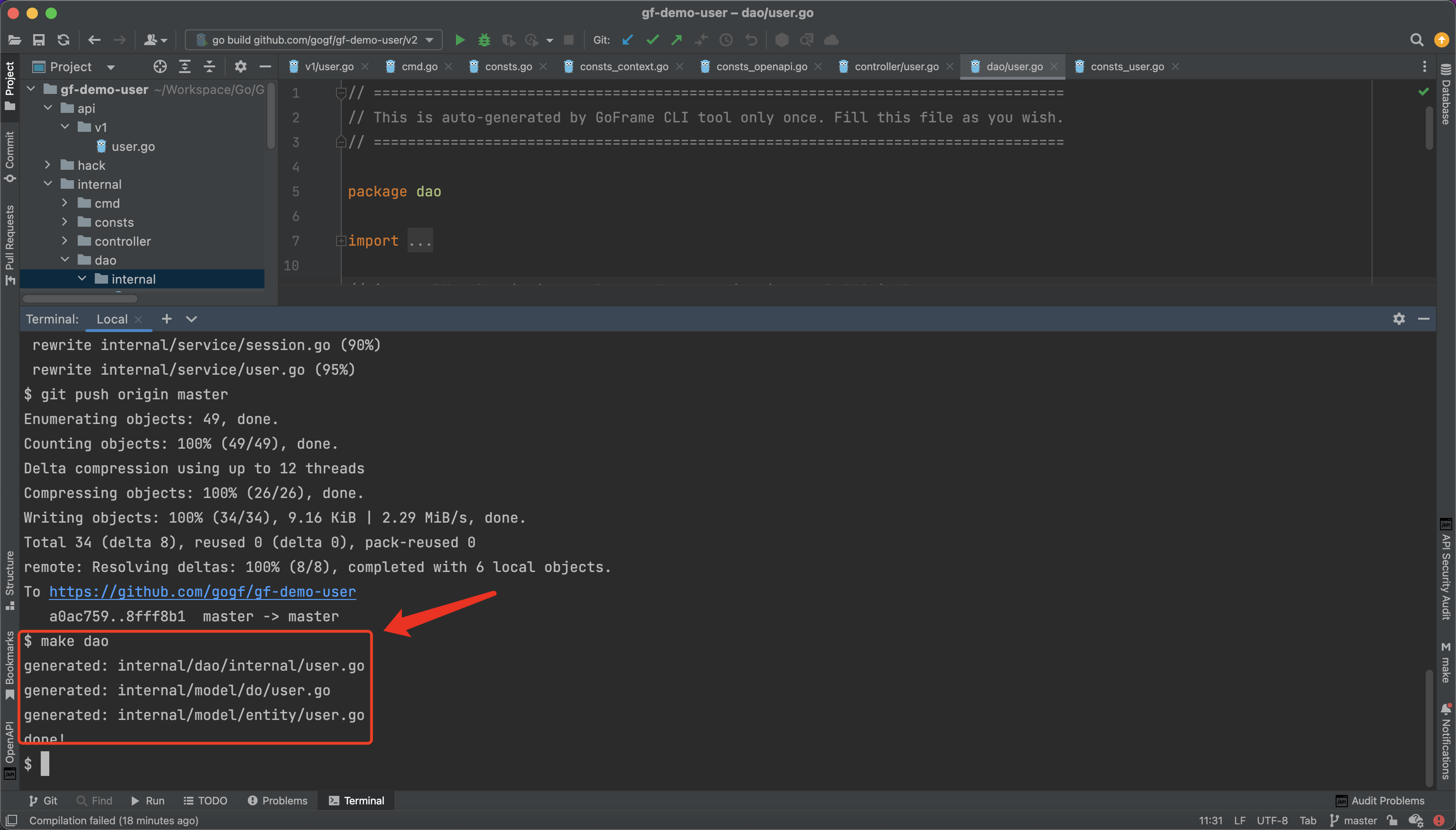 代码生成方式通过 make dao 命令,或者 gf gen dao 命令,如下: