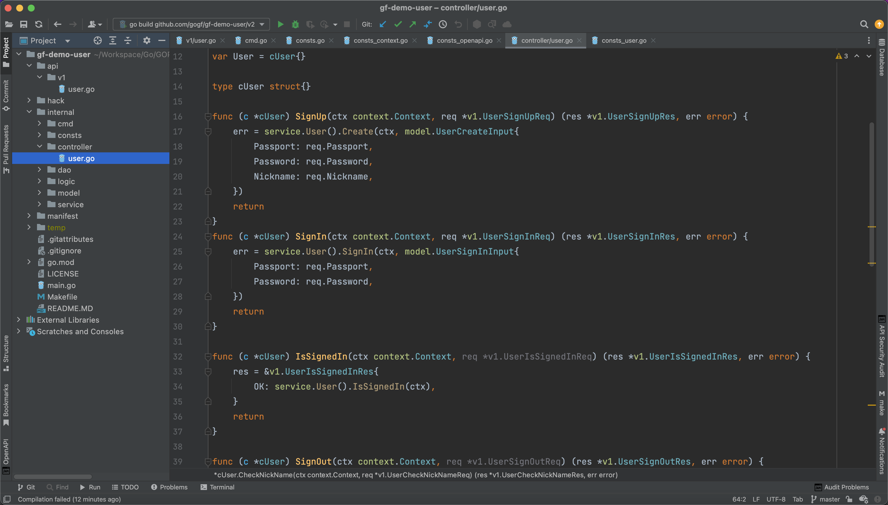业务的具体实现由 internal/logic 包维护,通过依赖注入的方式注册具体的实现对象到 internal/service 包下。
