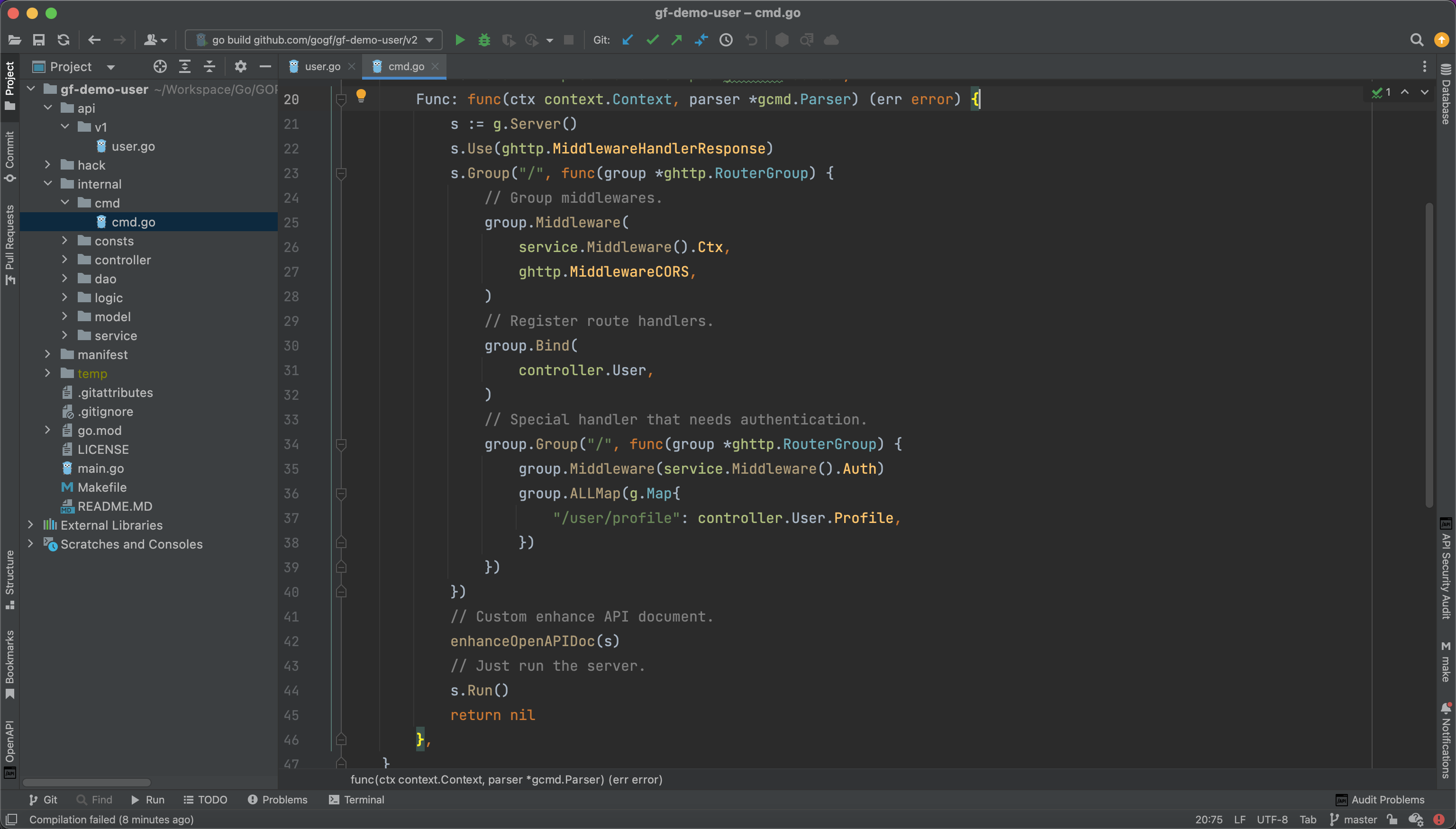 路由注册往往在 cmd 包中,在本项目中,仍旧采用灵活的分组路由注册方式。在部分路由中带有鉴权中间件,这部分路由需要鉴权后才能访问,感兴趣的小伙伴可以仔细研究下源码的实现原理。关于路由中间件的详细介绍请参考章节: 路由管理-中间件/拦截器