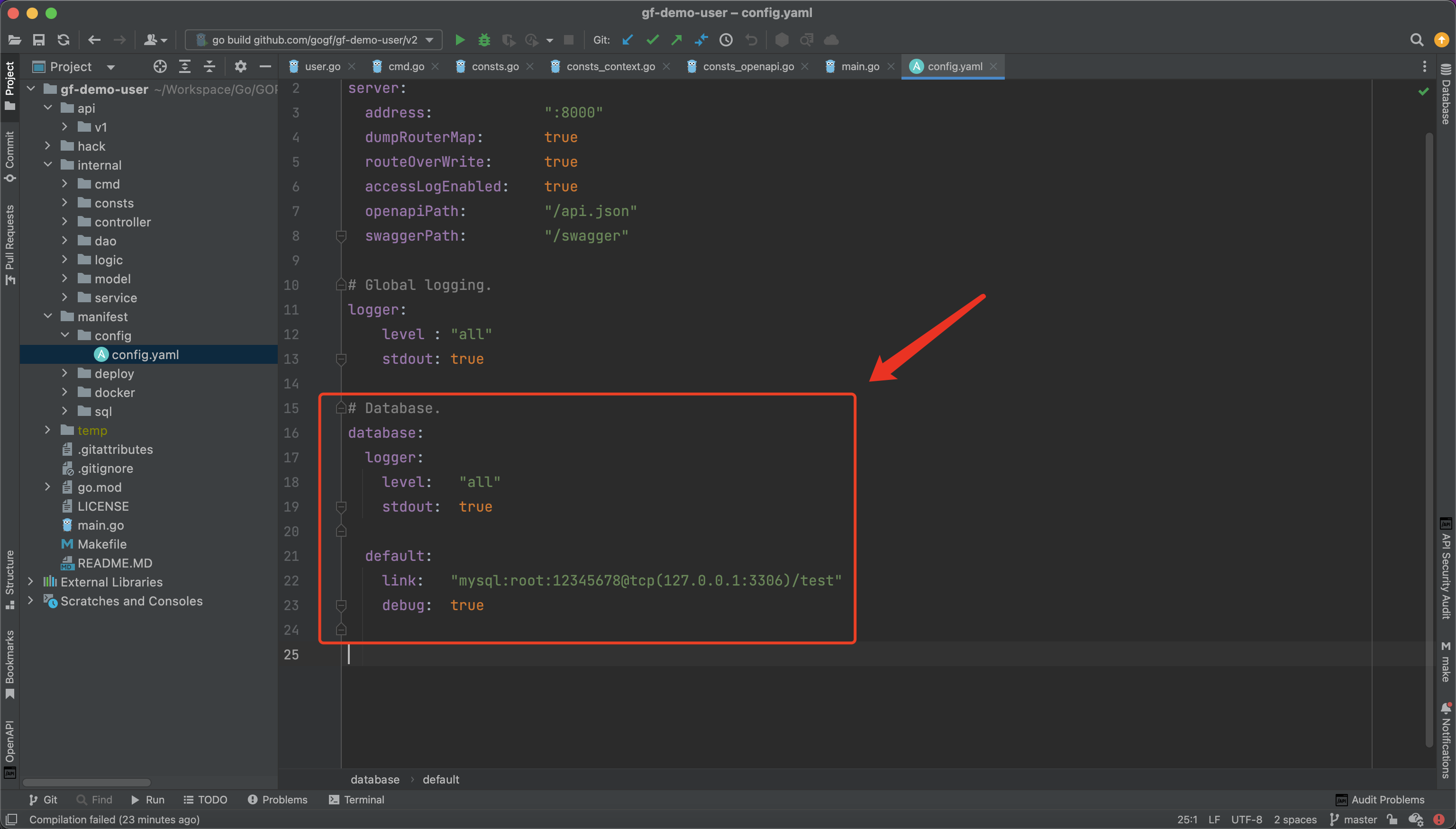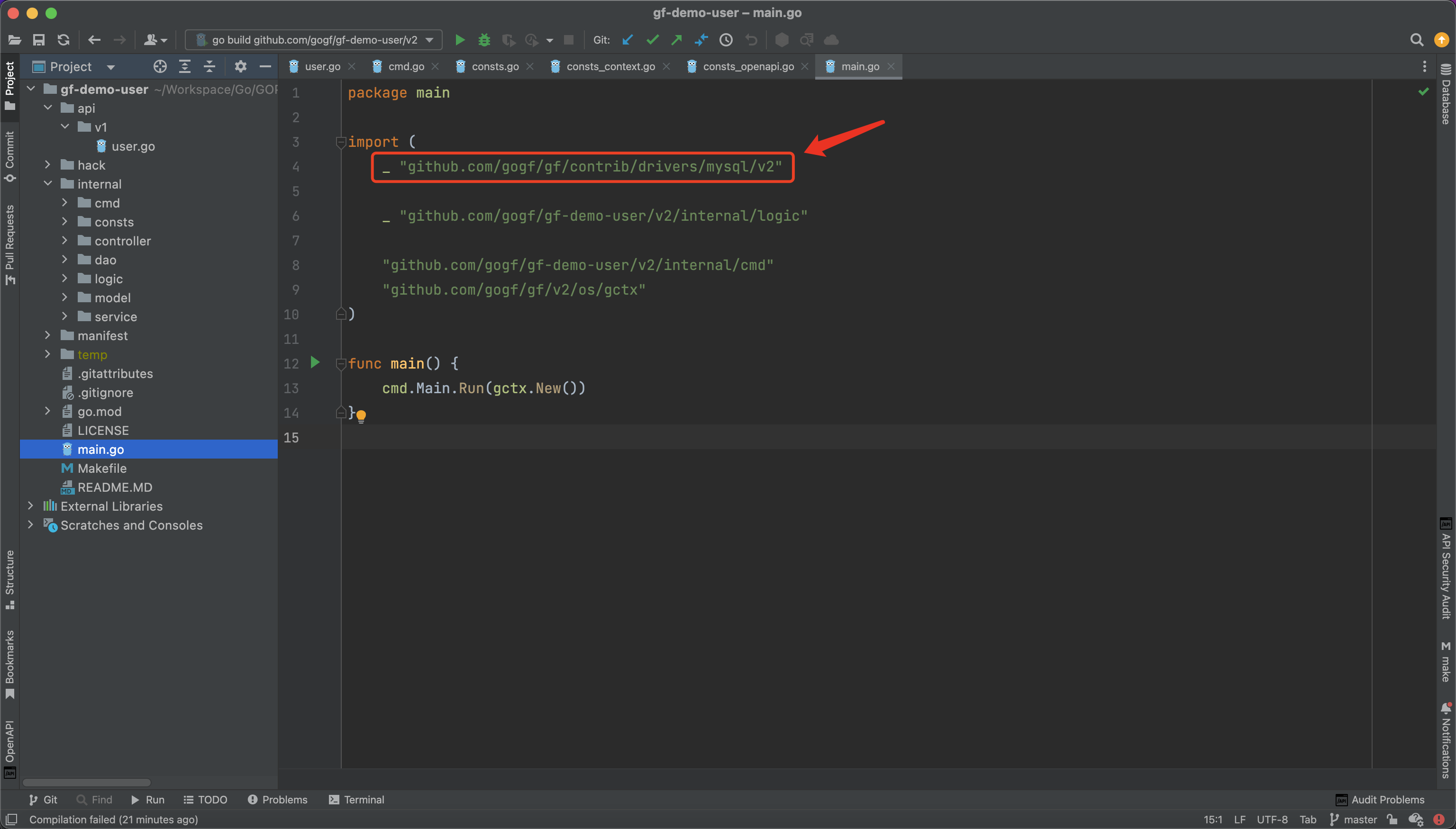 匿名包初始化方法需要通过 import 方式引入,该引入用于将业务逻辑具体实现注册到 internal/service 下。这种依赖往往需要在 main.go 中顶部引入。