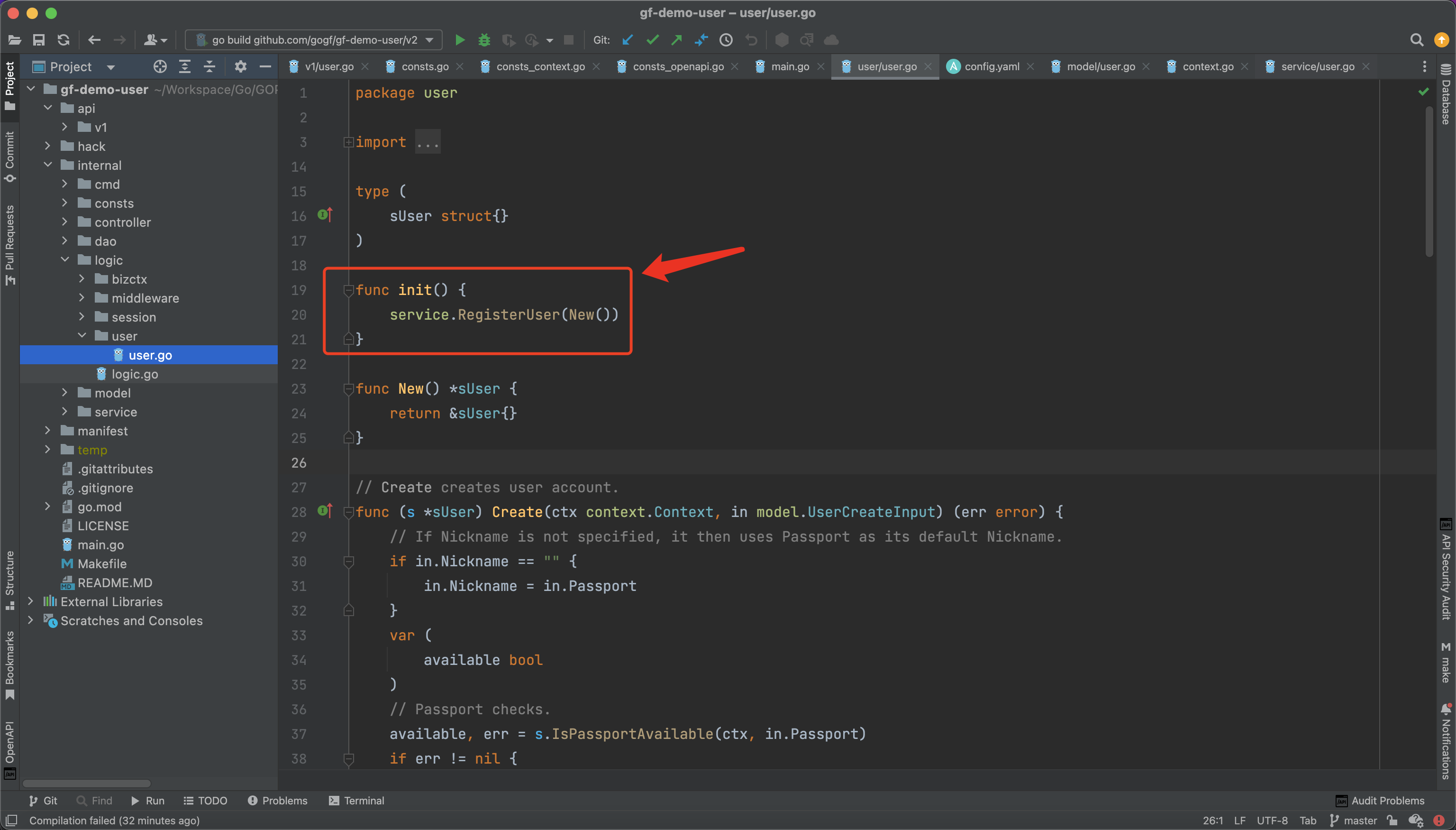 业务实现的依赖注入使用的是匿名包初始化方法 init,在匿名包初始化方法内部使用 service.RegisterXxx 的方式注入具体的接口实现对象。