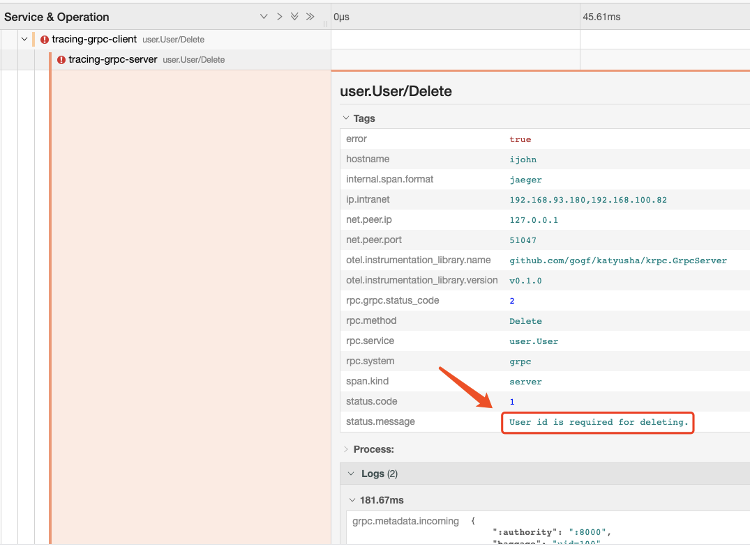 这里客户端的执行最后报了一个错误,那是我们 故意为之,目的是演示 GRPC 报错时的链路信息展示。我们打开 jaeger 查看一下链路跟踪信息: