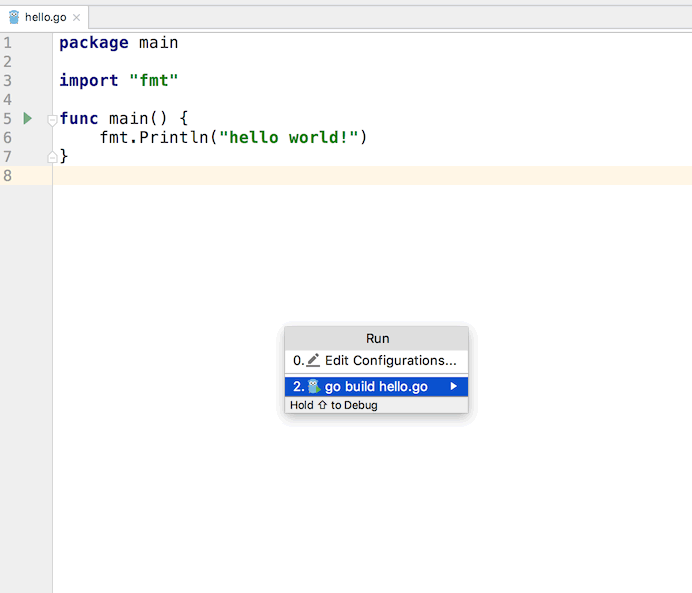Create a new go file named hello.go and input the following code:
